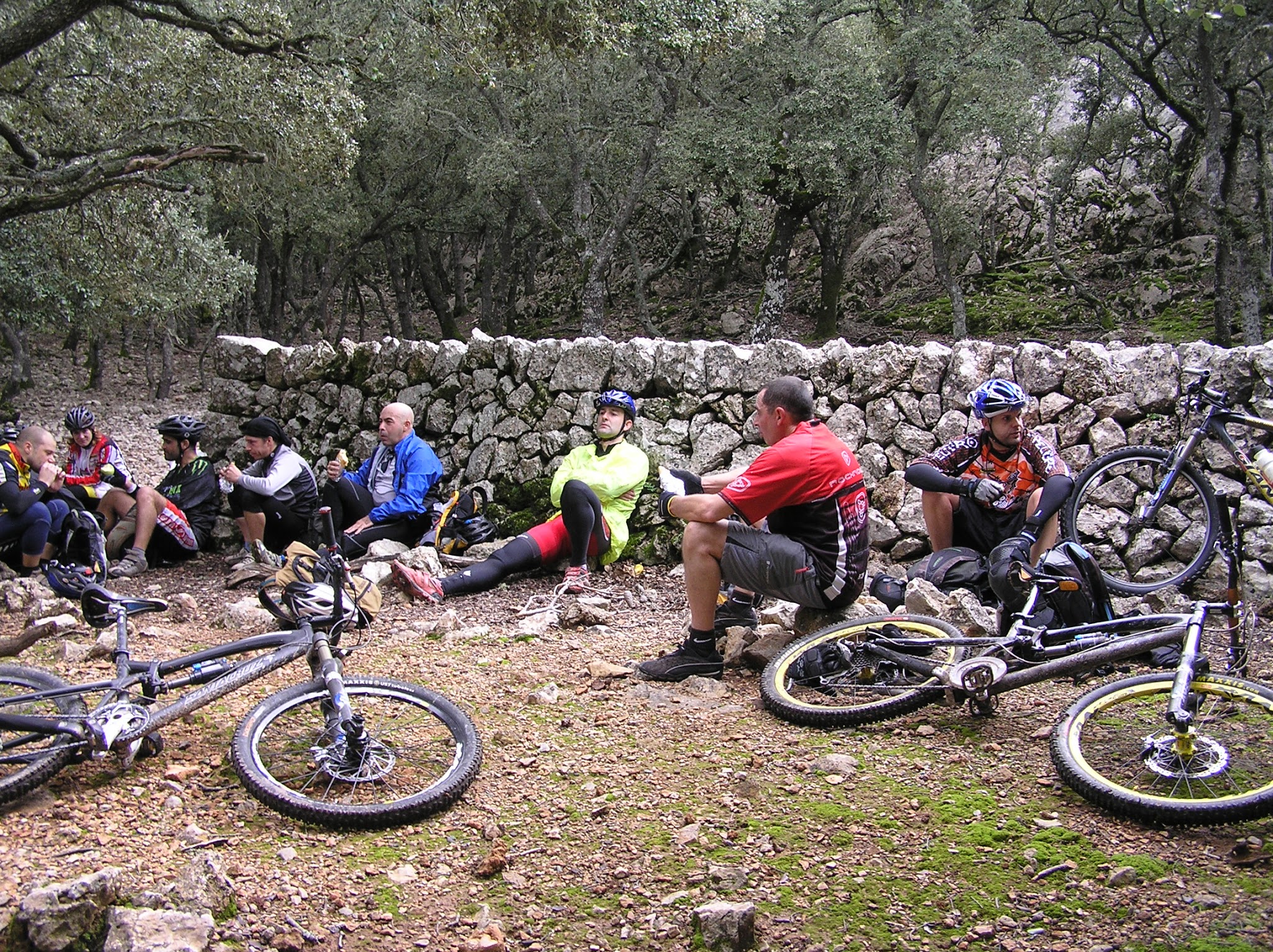 Bajamos hasta el segundo camino y efectivamente, en la primera curva a derechas, vi el hito, y luego otros aéreos, incrustados entre las ramas de las encinas. Solamente es un pequeño repecho hasta un coll de tords y detrás un sendero en descenso espectacular. Lo recorrí un corto tramo para asegurarme, solamente hasta que vi las rossegueres. Después volví atrás a buscar a mis compañeros y hacerlo con la bici. Para ser sinceros, hacerlo con la bici fue hacerlo nosotros y las bicis, cada uno por su lado, pero estoy seguro de que veré a alguien bajarlo, no lo pongo en duda. El paso por los deslizaderos no es complicado y enseguida estamos al otro lado donde ahora sí podemos montar con mejor suerte. Nos topamos con una pared con un portillo tapiado que nos obliga a encaramarnos y casi al lado, otra pared con otro portillo y a veces te preguntas por la finalidad de estas obras porque es evidente que tuvo que tener alguna, ya que el tiempo y el coste gastado en su construcción tuvo que ser importante. Pero desde luego yo no me lo imagino a día de hoy.