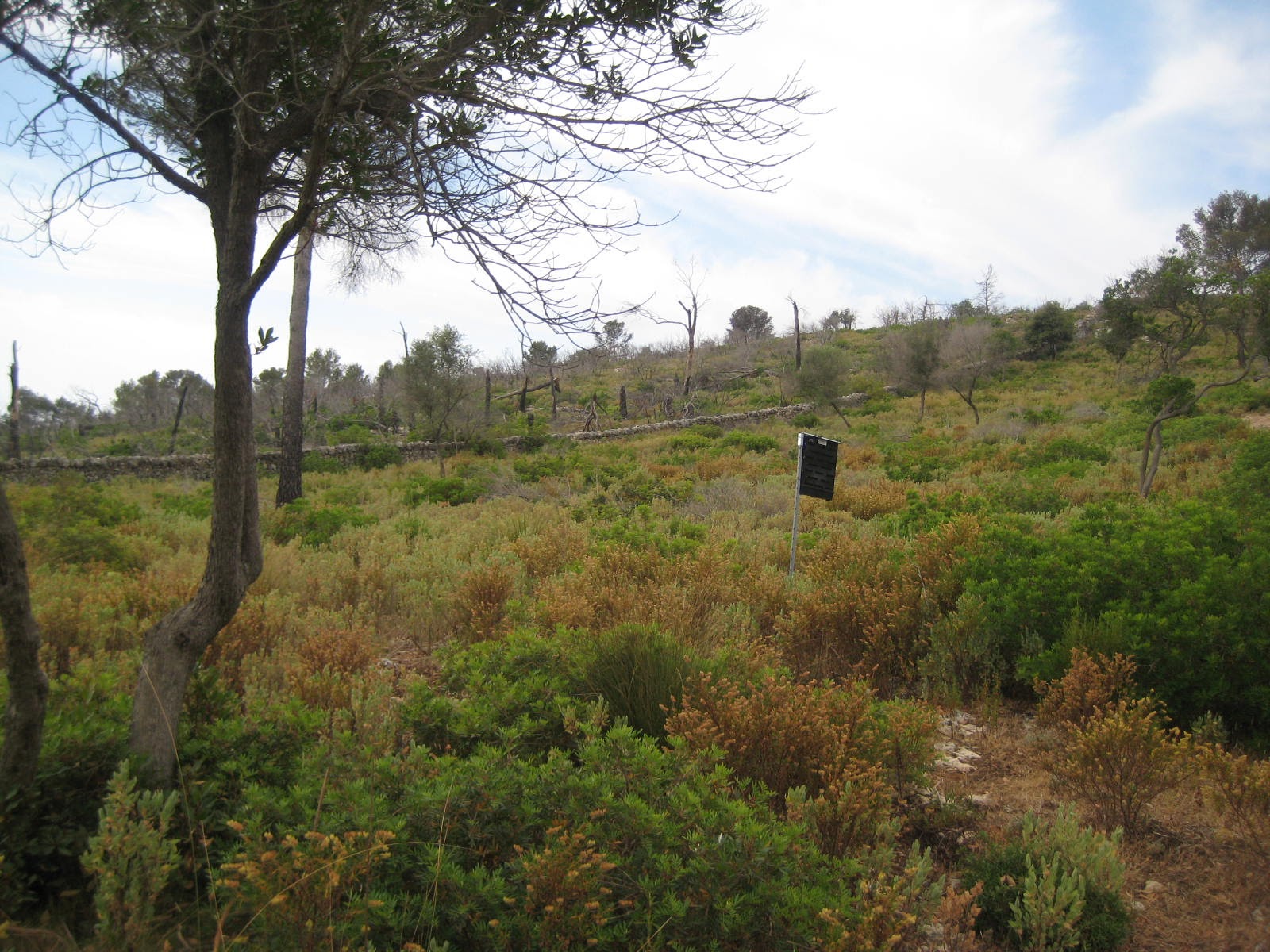 Salí un poco tarde de casa tras enmendar un pequeño accidente doméstico que tuve e hice la aproximación directa al lugar, obvio que no encontrara a nadie de camino. Subida sin mucho misterio por el interior del socavón sin ir directo al puig de ses Gatoves, lo alargué un poco más por el camino lateral y una vez arriba sigo sin interrupción a buscar el camino-torrentera que baja a la carretera pero en lugar de bajar subo y llego a la encrucijada. Mi destino es el coll de Son Marill aunque ganas de bajar no me faltan sabiendo como sé ahora que puedo enlazar una bajada que tengo ahí a medias con la nueva subida pero me contengo y me voy directo a la mina para enlazar después con la pista de arriba para llegar al coll, hoy más solitario que nunca después de la redada de la semana pasada.