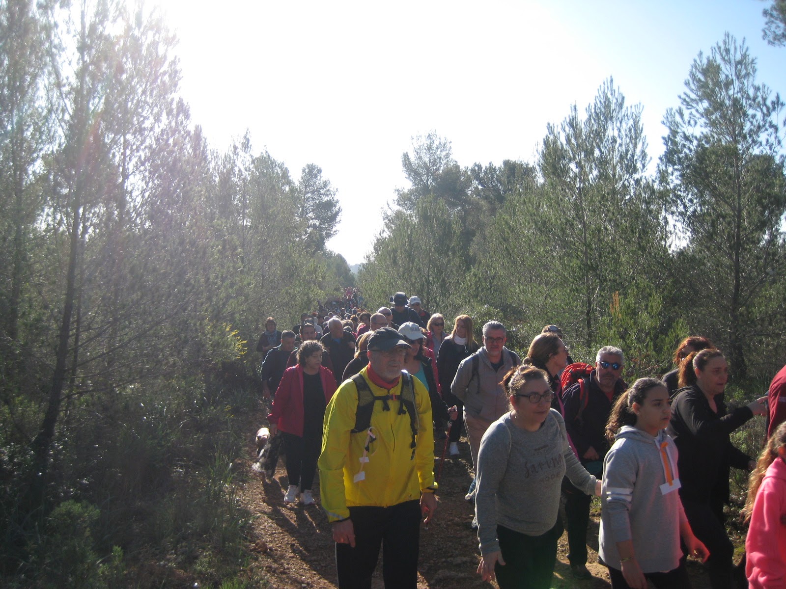 Entonces baja un bikero desde arriba y me reconoce, era Juan de los Bous y me comenta que vienen otros también a sumarse al mogollón, y efectivamente al rato van llegando, está Aure, Benjo, Tomeu, Toni, Miguel C., Charly y un Trabucat al que ahora mismo no puedo nombrar, y nos quedamos allí mismo esperando que acaben de pasar todos los senderistas, que son muchos (unos 500 acaban de decir en las noticias). Al aflojar un poco el tráfico nos han dejado unos cuantos que querían estar pronto en casa y los demás hemos dado algunas vueltas por la zona baja que no me ha ido mal para probar la horquilla ya que la tenía muy descompensada, mucha diferencia de presión entre las cámaras con unas sensaciones en marcha muy desagradables aunque después de los ajustes creo que ha mejorado, un poco dura me ha quedado, me parece.