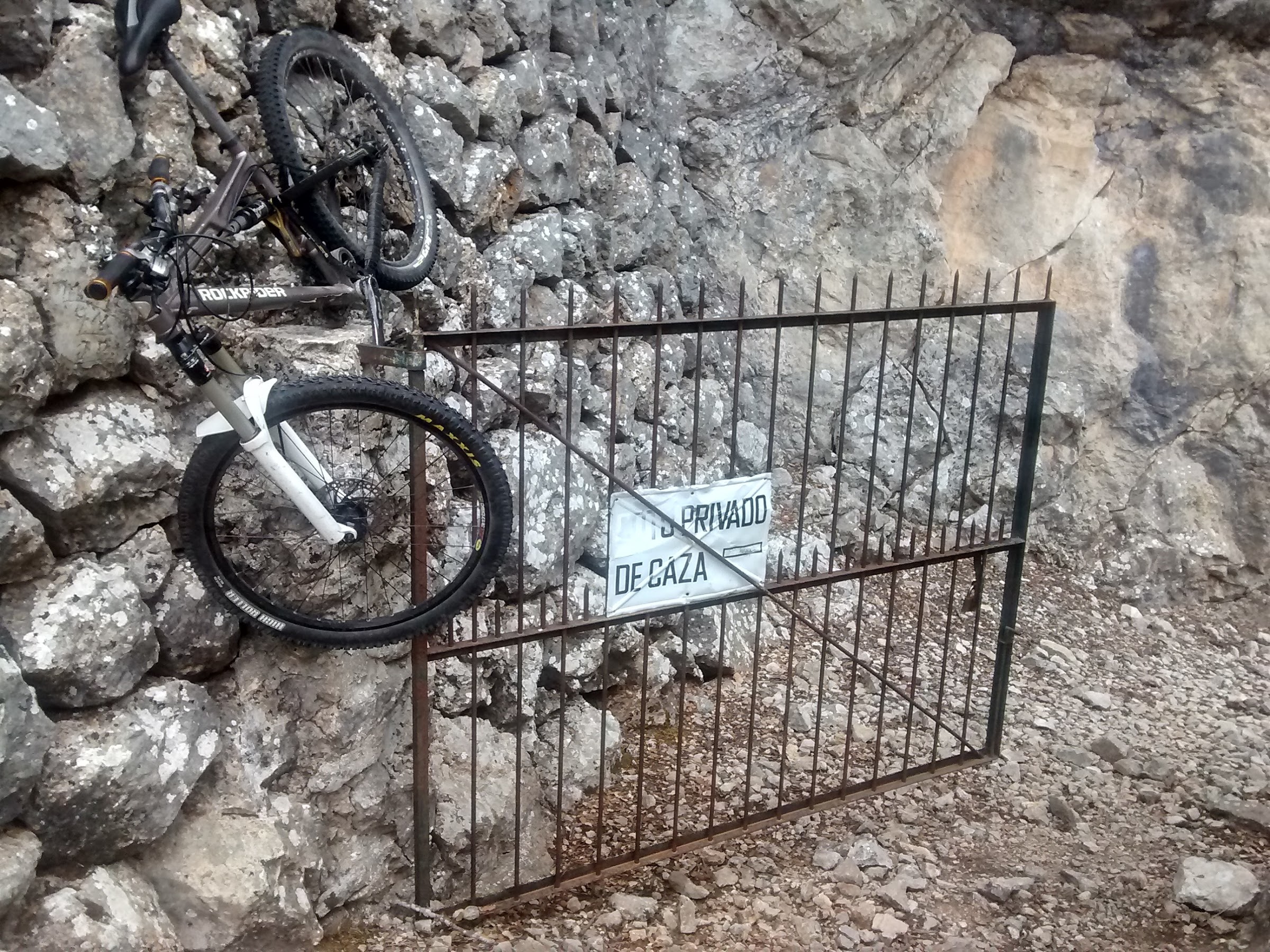La primera parte de la bajada es muy técnica, solo apta para verdaderos expertos, y no pidáis velocidad, olvidarse de este tema por ahora, solamente hay que concentrarse en permanecer el mayor tiempo posible sobre el sillín, el que ha venido sabe que no exagero, y no digamos ya de los tramos en los que el camino parece literalmente haber desaparecido. Los puntos principales son los rotlos de sitja, en los que aparecen caminos de carro pero me metí por el primero, encontré la pared y pasé al otro lado y no debí haberlo hecho ya que este es el primero que encontré en su día bajando por otro lado y es el que en peores condiciones se encuentra, debía haber continuado por el sendero hasta el otro rotlo y aún más allá, también por sendero, hasta el camí des Correu, que es por donde bajamos Terròs y yo la última que subí ahí, y es lo que quería hacer y no hice, pero ahora ya estoy abajo, junto a la potada des cavall y tiro directo para abajo y no paro hasta la carretera más que lo justo para abrir la barrera intermedia, he de reconocer que me llevé una buena matraca en ese tramo, el más rápido que he hecho hasta la fecha, para no llevar frenos, todo un logro.