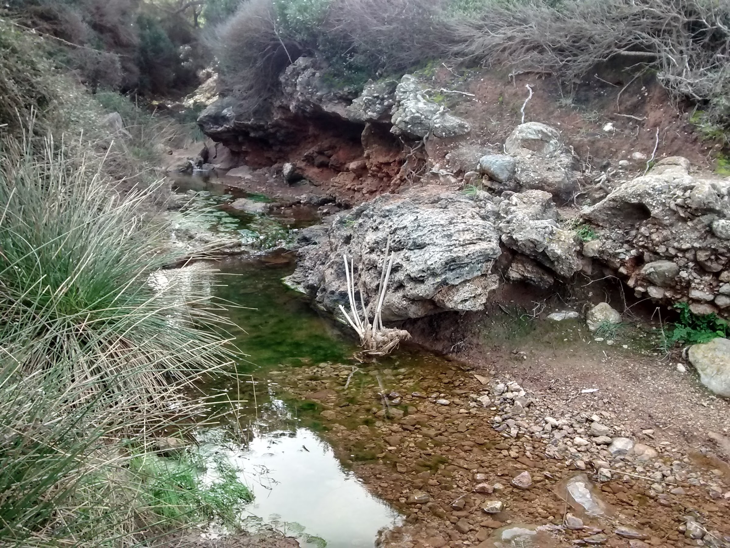 La bajada es muy corta hasta el punto más bajo y me encuentro otro allí que baja la trialera andando, motivo que es excusa para cruzar unas palabras y continuar adelante. Esta vez no voy al mirador, estuve no hace mucho y sigo recto buscando la parte de bajada más exigente que me llevará a las pistas amplias y aunque con cazadores concentrados por allí, sin que se produzca ningún tipo de incidencia. Antes de llegar al cable que corta el paso oigo ruido de cubiertas tras de mí, es el ciclista de antes que vuelve aunque ahora no se entretiene en charlas, de hecho nos volvimos a encontrar en la carretera donde sí seguimos la conversación durante unos minutos antes de volver a partir por caminos diferentes, él continuaba por pista y yo me iba por el sendero paralelo a la carretera hacia el coll de sa Creu, digo sendero porque es lo que parece pero seguro que es un camino de carro, muy camuflado pero de carro.