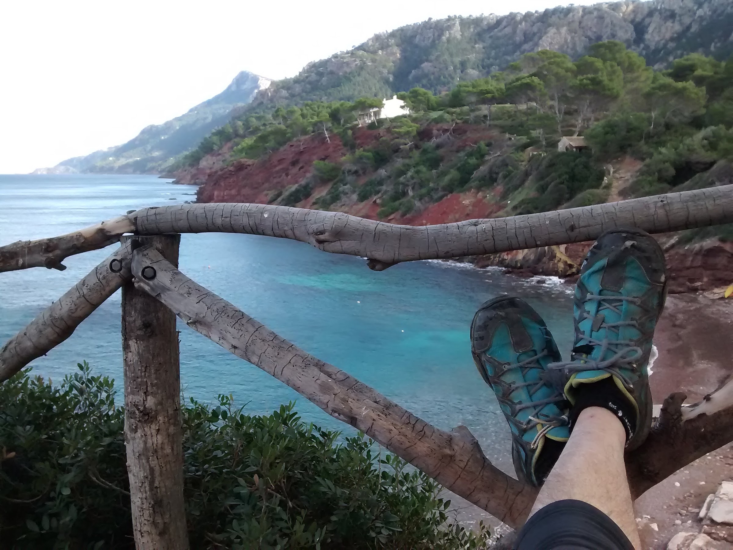 No hay problema para empezar pero es solo una ilusión, la cosa se complica a las primeras de cambio y eso que dicen que está limpio, y no digo que no pero la habilidad para transitar por él debe ser mayúscula y la bici debe acompañar, desde luego. Está claro que no se me dan tales condiciones y visto desde fuera podría decirse que fue un descenso penoso aunque se intentó. Y resulta que esta primera parte es la mejor, pues si que vamos bien, ya que al circular después con menos pendiente el camino pierde definición al no estar elaborado, está más trabado y eso que se sigue notando que por aquí también ha tenido algún arreglo. Damos a la pista de la Cova muy cerca de la barrera, eso quiere decir que queda bastante descenso hasta el mar, y me pregunto si habrá algún otro ramal que continúe fuera de la pista principal, no lo vi desde luego, cualquiera aparta la vista siquiera una décima de segundo de lo que tienes delante, por lo que bajé directo hasta la playa donde hice un receso, debía reponer algunas calorías y afrontar el largo trecho que tenía por delante hasta Banyalbufar.