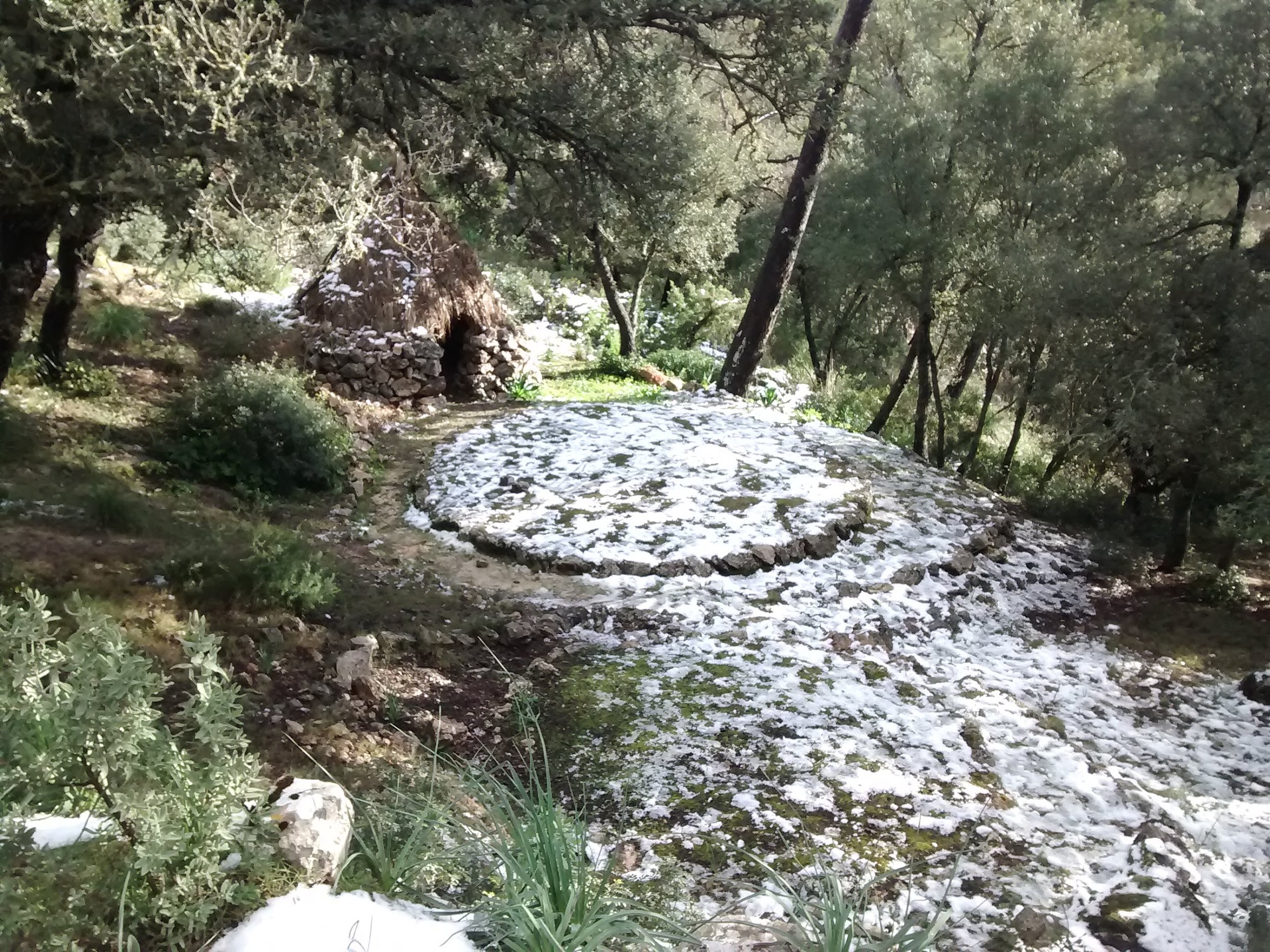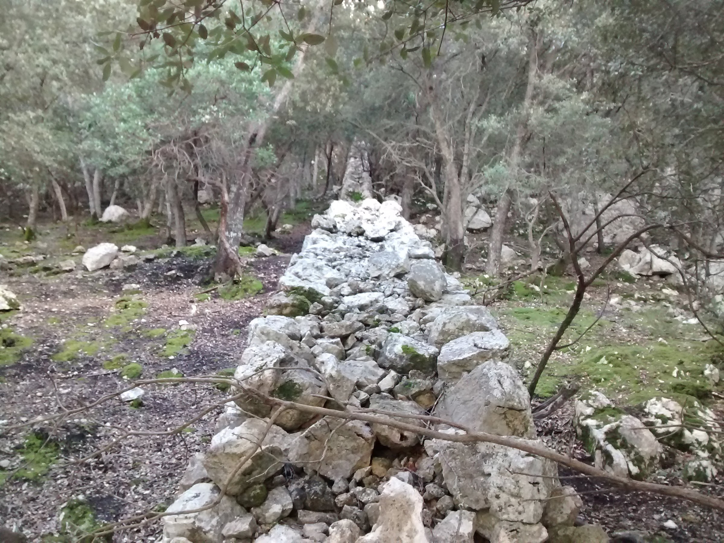 Veo actividad, mucha actividad, en la ladera del monte que tengo enfrente, parece que le han dado un lengüetazo gigante y ha desparecido todo rastro vegetal y en cambio ha aparecido una sucesiva extensión de terrazas desde abajo hasta lo más alto y no adivino el motivo del suceso pero ello me lleva a acordarme de algunas salidas ya antiguas efectuadas por la zona y que no estaría mal volver a recordar. El inicio es empinado por las calles del pueblo pero no es complicado, basta cruzar el torrente por el puente peatonal y seguir las indicaciones para ir a buscar el centro del Imedea para rodearlo por detrás y enfilar hacia la Claraboia. El camino que prosigue cruza la zona ¿en obras? donde aún hay máquinas removiendo piedras y amontonando madera de los pinos talados, quedan algunos árboles en pie, parecen frutales, pero son pocos y el conjunto se asemeja casi más a una zona devastada que a otra cosa. Llego a la barrera de la que sí me acuerdo pero que se me antoja ahora desubicada aunque lógicamente no se ha movido del sitio y a partir de ese punto nada parece haber cambiado, los mismos trastos tirados, las mismas ruinas, el mismo camino, todo parece estar en su sitio sin haberse inmutado.