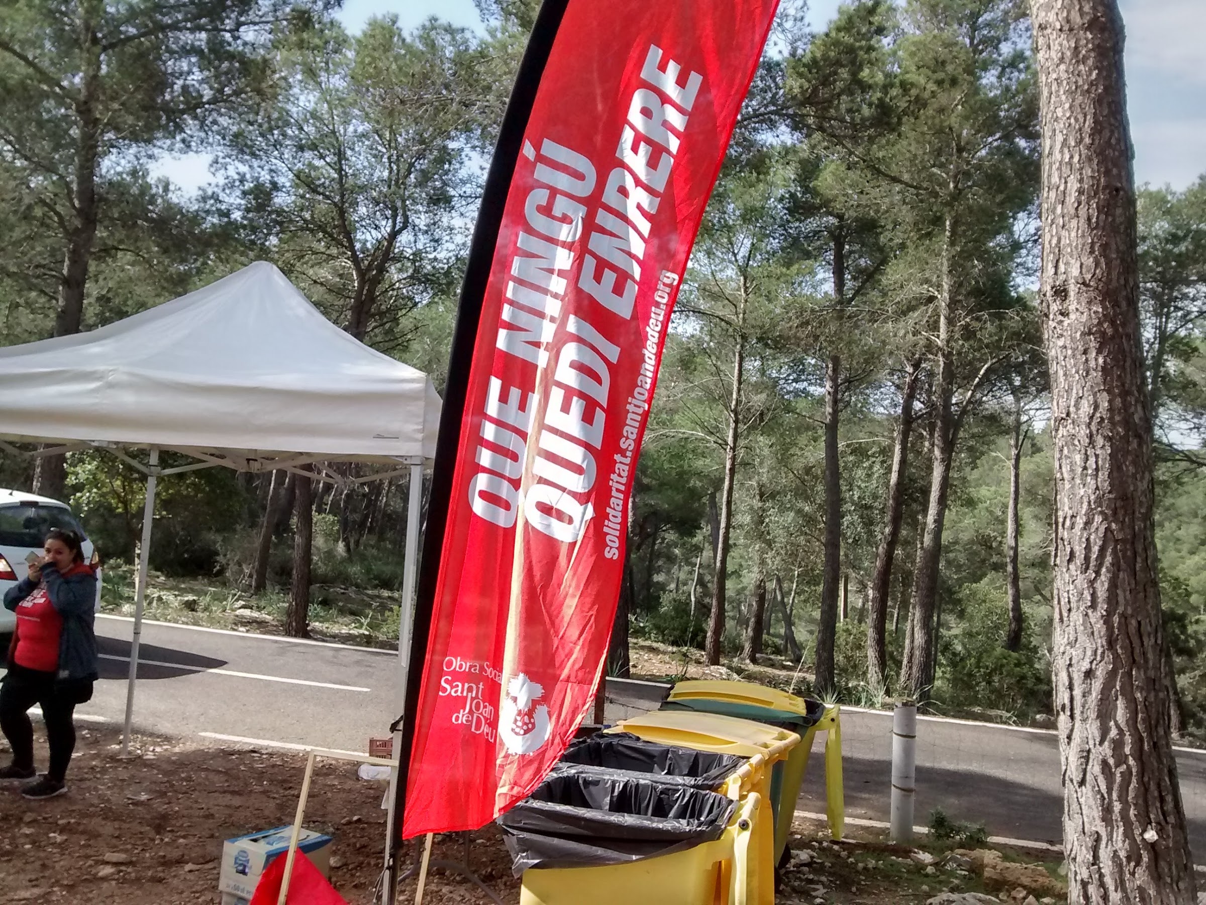 Las dejé atrás justo empezar la bajada y al llegar a la carretera veo que hay una carpa montada con viandas y bebidas y un grupo de ciclistas guiris dando buena cuenta pero en realidad el asunto no iba con ellos sino con los senderistas ya que lo que se había organizado era una caminata solidaria pero al haber pasado ya el grueso de los senderistas estaban repartiendo los sobrantes y también me invitaron. No estuve mucho allí, iba un poco retrasado y no continué hacia el mirador, de hecho bajé por el sendero lateral que vi que estaba marcado, también era su itinerario aunque me pareció raro que no hubieran quitado de en medio un tronco que me comí con la cara y no me hizo nada de gracia.