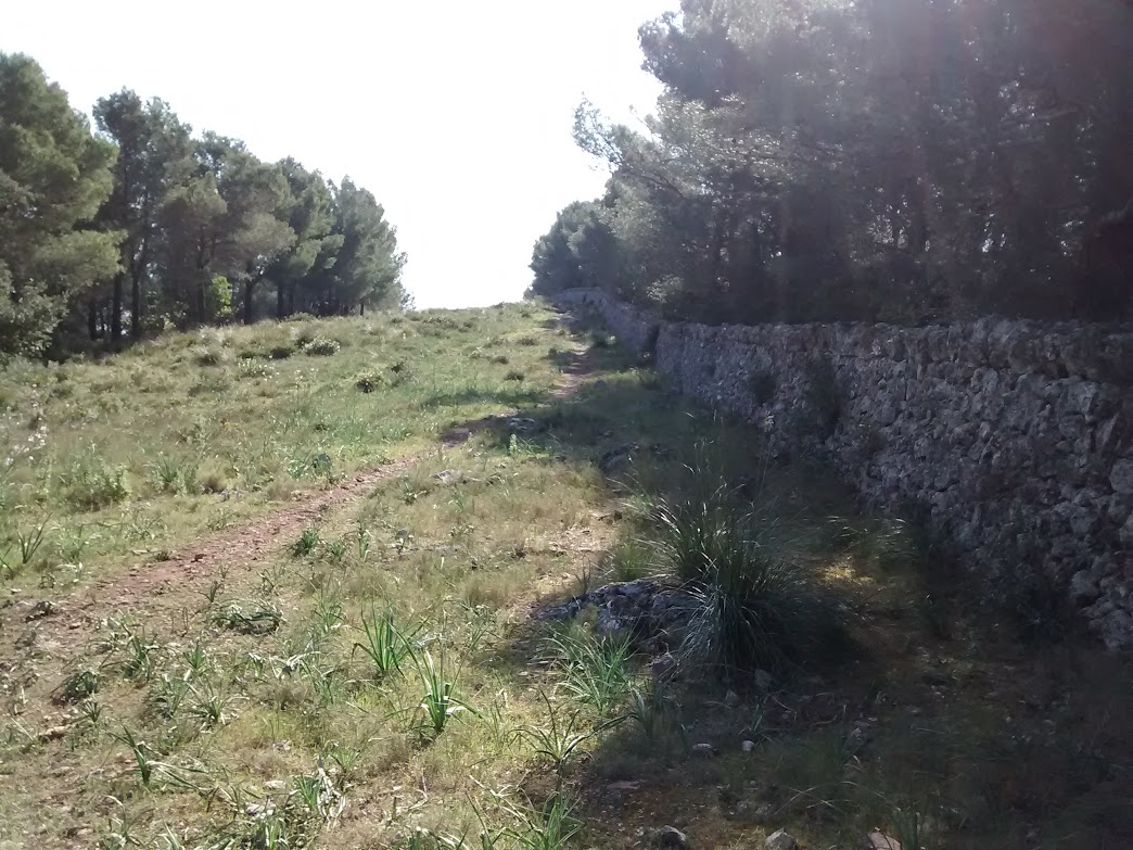 Empiezo en Binissalem y me paseo hasta Lloseta por el camí del Raiguer, es un poco más largo que el trayecto directo pero más entretenido, hoy sí que me desvío del camino asfaltado del cementerio que me había quedado pendiente del otro día, atravieso el torrente y tiro hacia Aumedrà añadiendo a cada pedalada que damos algo más de dureza, no digamos ya cuando dejamos el asfalto y nos aprestamos a atravesar el Estret, no voy a llegar al refugio, se me sale de la ruta, entro en Sollerich tomando enseguida el GR que en esos primeros metros no se puede decir que tenga mucho de camino y casi sin darnos cuenta entramos en una de esas estupendas y bien conservadas pistas que atraviesan la finca aunque la parte final para llegar arriba vuelve a ser un sendero empinado, menos mal que pensaron en eso los que diseñaron la plaza y añadieron un banco comunal que en alguna ocasión he requerido más de la cuenta.